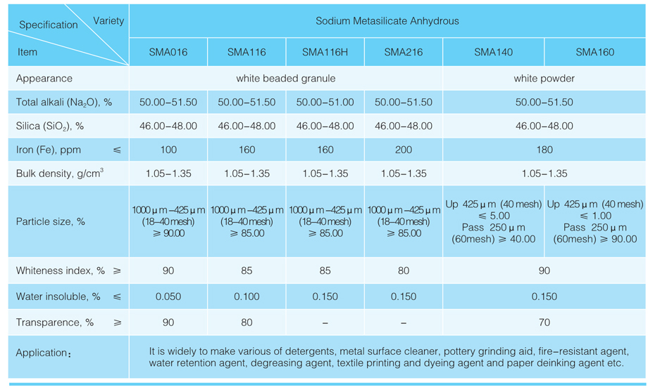 Standard compliance: HG/T 2568-2008 "Industrial Sodium Metasilicate",Enterprise Standard Q/0213DYP 001-2013 "Industrial Sodium Metasilicat".